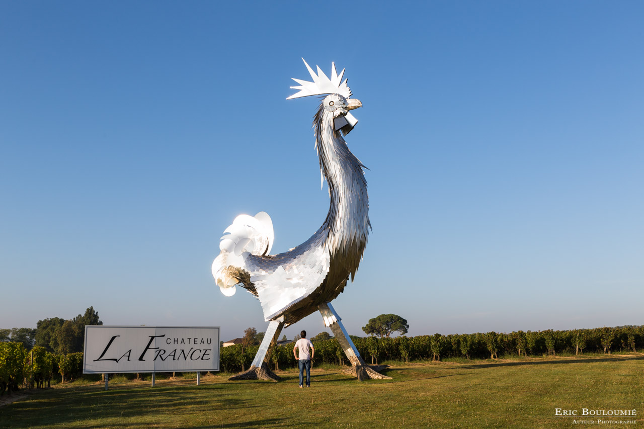 Aujourd’hui, une photo prise à Beychac et Cailleau, le coq du sculpteur Georges Saulterre sur le domaine du château La France dans le vignoble bordelais. Celle-ci a été prise le 12 septembre 2014 à 08:43.