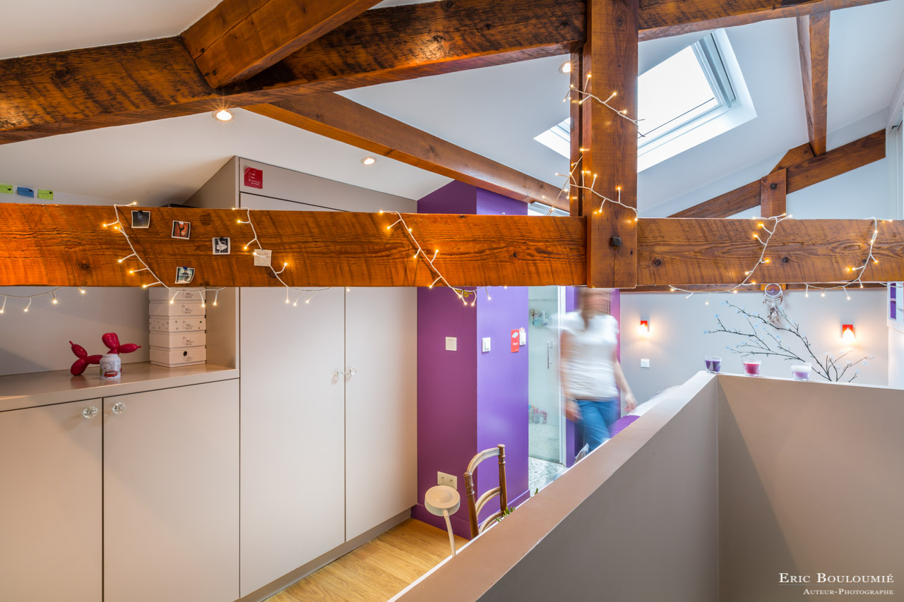 Le reportage photo réalisé quelques mois après la fin du chantier fait ressortir le travail de l’architecte d’intérieur et met en avant les différents volumes réalisés afin de donner une vision des espaces créés.