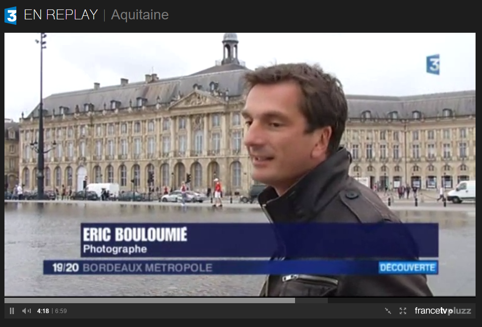 Photographe professionnel sur Bordeaux spécialisé dans l’architecture, la photographie d’entreprise et la photo d’illustration (notamment pour la presse), j’ai été contacté par France 3 Aquitaine dans le cadre d’une série de reportages sur le miroir d’eau.