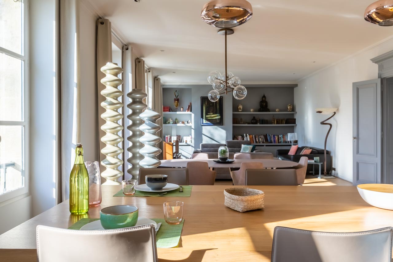 La troisième étape pour réaliser une photo d’intérieur concerne la lecture de la lumière. Contrairement à une idée reçue, l’intérieur d’une maison ou d’un appartement ne se photographie jamais avec les lumières allumées… l’ambiance d’un lieu est toujours plus valorisée en utilisant la lumière naturelle. L’impact de celle-ci n’a pas d’équivalent et une lumière artificielle (sauf certains cas particuliers) réduira toujours la puissance d’une image. Maintenant, selon le moment de la journée, la lumière naturelle aura un effet totalement différent sur le rendu photographique du lieu. Un éclairage de côté avec un soleil de début ou de fin de journée souligne et accentue les volumes et les ombres tandis qu’un éclairage avec un ciel couvert ou un soleil haut uniformise l’ensemble.
