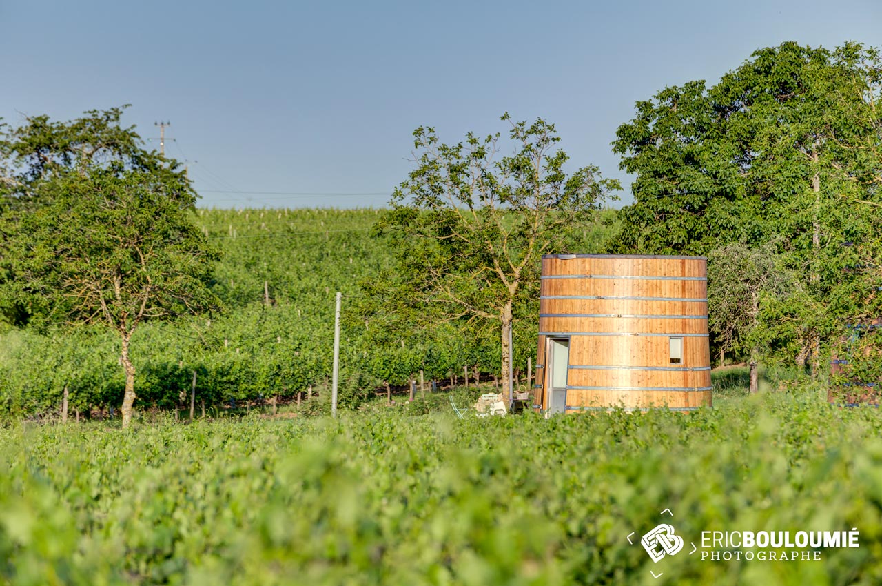 A 10 km de Saint Emilion, à Saint-Jean de Blaignac, le château de Bonhoste est au cœur vignoble girondin. Un écrin de verdure que j’ai pris plaisir à photographier. L’implantation a une importance capitale dans le choix d’une chambre d’hôtes. Ici, dormir dans une foudre permet de vivre une expérience oenotouristique dans son intégralité : visiter un château avec des propriétaires passionnés par leur métier, s’immerger dans le vignoble de l’Entre deux Mers et de Saint Emilion, classé au patrimoine UNESCO, découvrir un terroir particulier, nourri par la roche calcaire que vous pourrez voir dans la cave souterraine qui sert aujourd’hui de lieu d’affinage. Tout cela doit ressortir du reportage photographique qui illustrera les divers supports de communication. La vigne et le bois doivent marier leurs couleurs, et être au cœur des visuels.